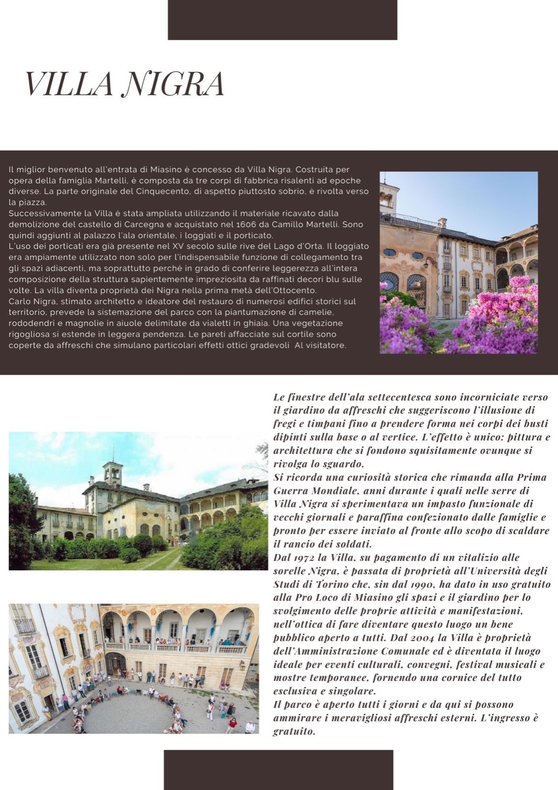 Miasino è un come di montagna dall’origine antica, basato su attività zootecnica ed un crescente sviluppo del turismo. L’abitato si trova localizzato sulla cima di un basso colle, dove si possono trovare anche antiche case signorili e ville con ampi giardini.