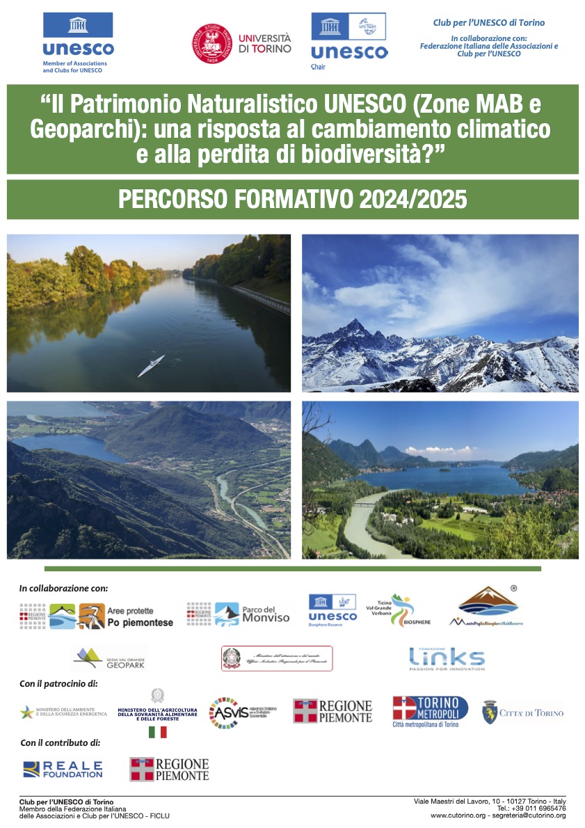 Lunedì 25 Novembre dalle 15.00 alle 18.00 si è tenuto presso il Campus ONU di Torino il primo incontro pomeridiano di formazione (trasmesso anche online) nell’ambito del Percorso Formativo 2024/25 “Il Patrimonio Naturalistico UNESCO, Zone MAB e Geoparchi: una risposta al cambiamento climatico e alla perdita di biodiversità?”, organizzato a cura del Club per l'UNESCO di Torino.