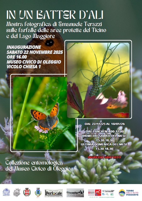 Sabato 22 novembre, alle ore 16 presso il Museo civico di Oleggio, si inaugurerà "In un batter d'ali", mostra fotografica di Emanuele Terazzi sulle farfalle delle Aree protette del Ticino.