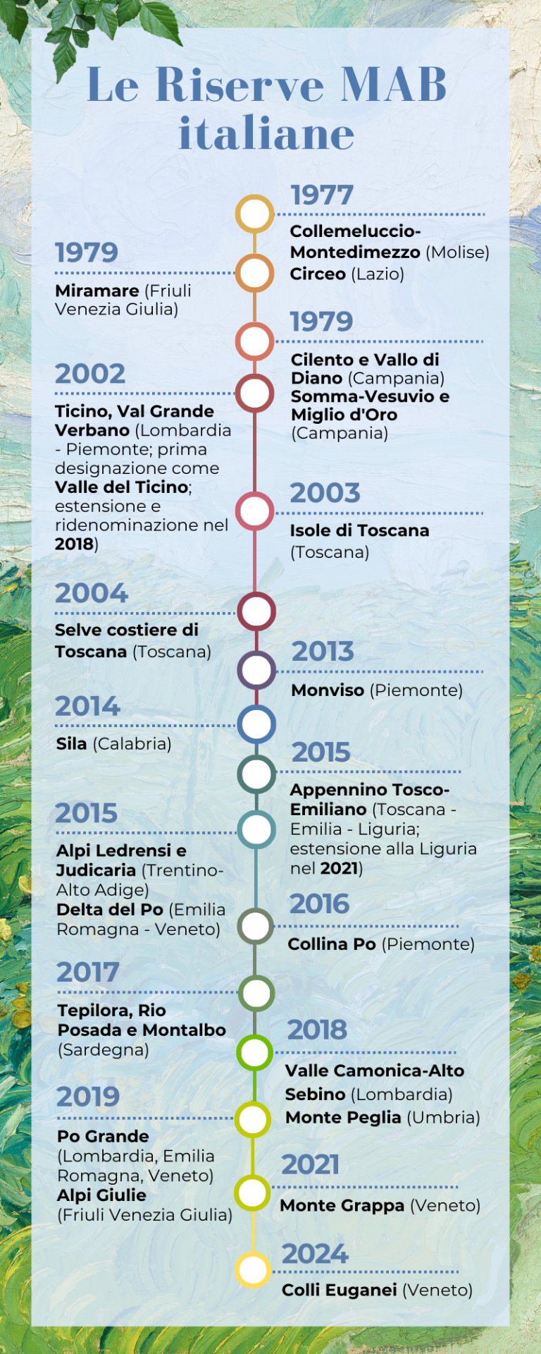 La Rete italiana delle aree MAB include oggi (dato 2024) 21 Riserve della Biosfera: