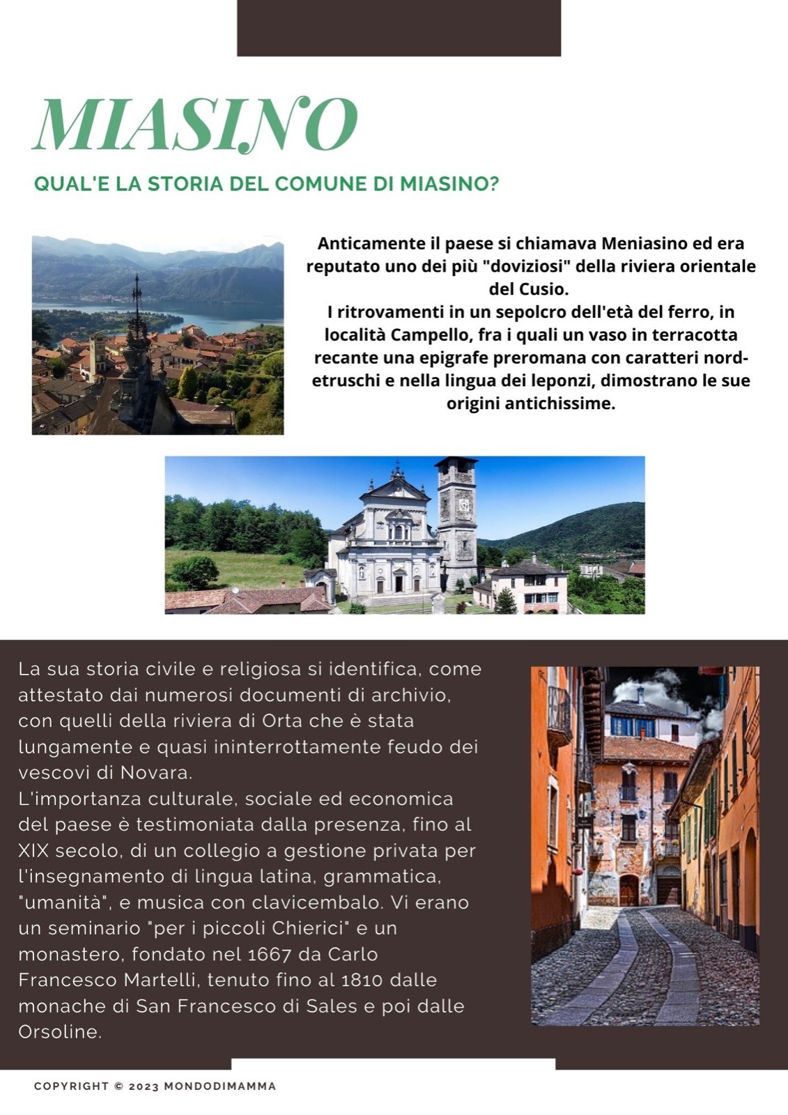 Miasino è un come di montagna dall’origine antica, basato su attività zootecnica ed un crescente sviluppo del turismo. L’abitato si trova localizzato sulla cima di un basso colle, dove si possono trovare anche antiche case signorili e ville con ampi giardini.