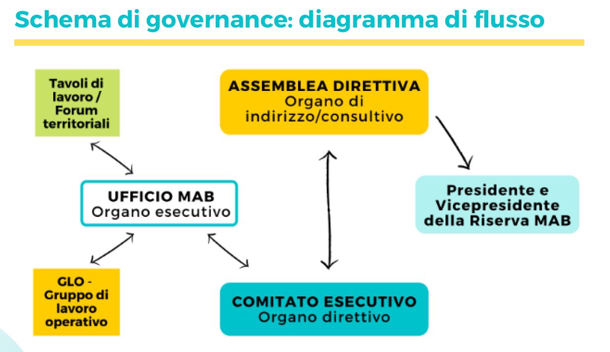 - Directive Assembly: It represents the emblematic locus of the representativeness of the Reserve's governance, and its composition is intended to best combine the participation of the various representative bodies and subjects at territorial level. The Directive Assembly is meant to provide the strategic guidelines on which to base the actions of the MAB Reserve. It is a proactive management structure that provides the Executive Committee with guidelines for action to be implemented through the MAB Office.
