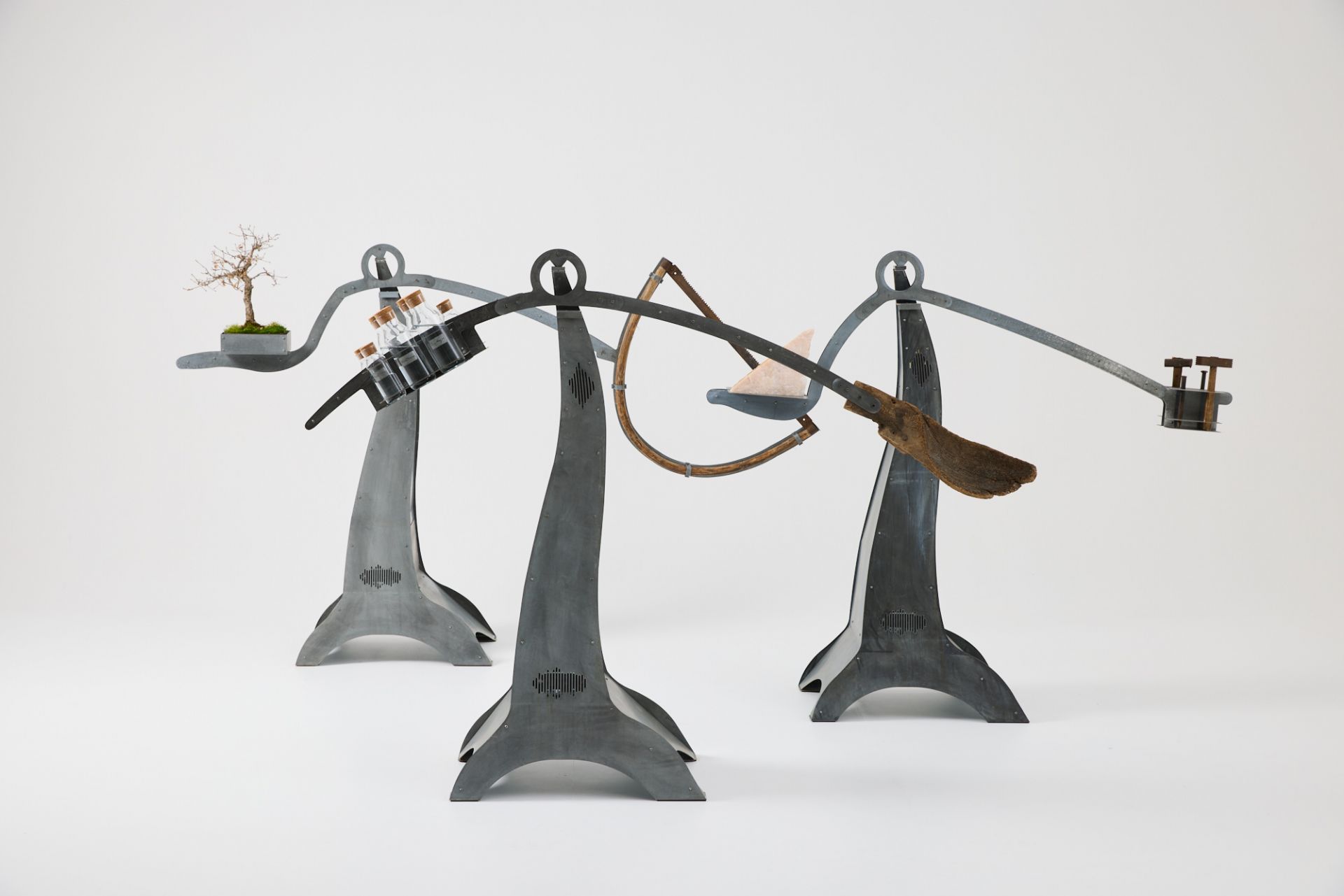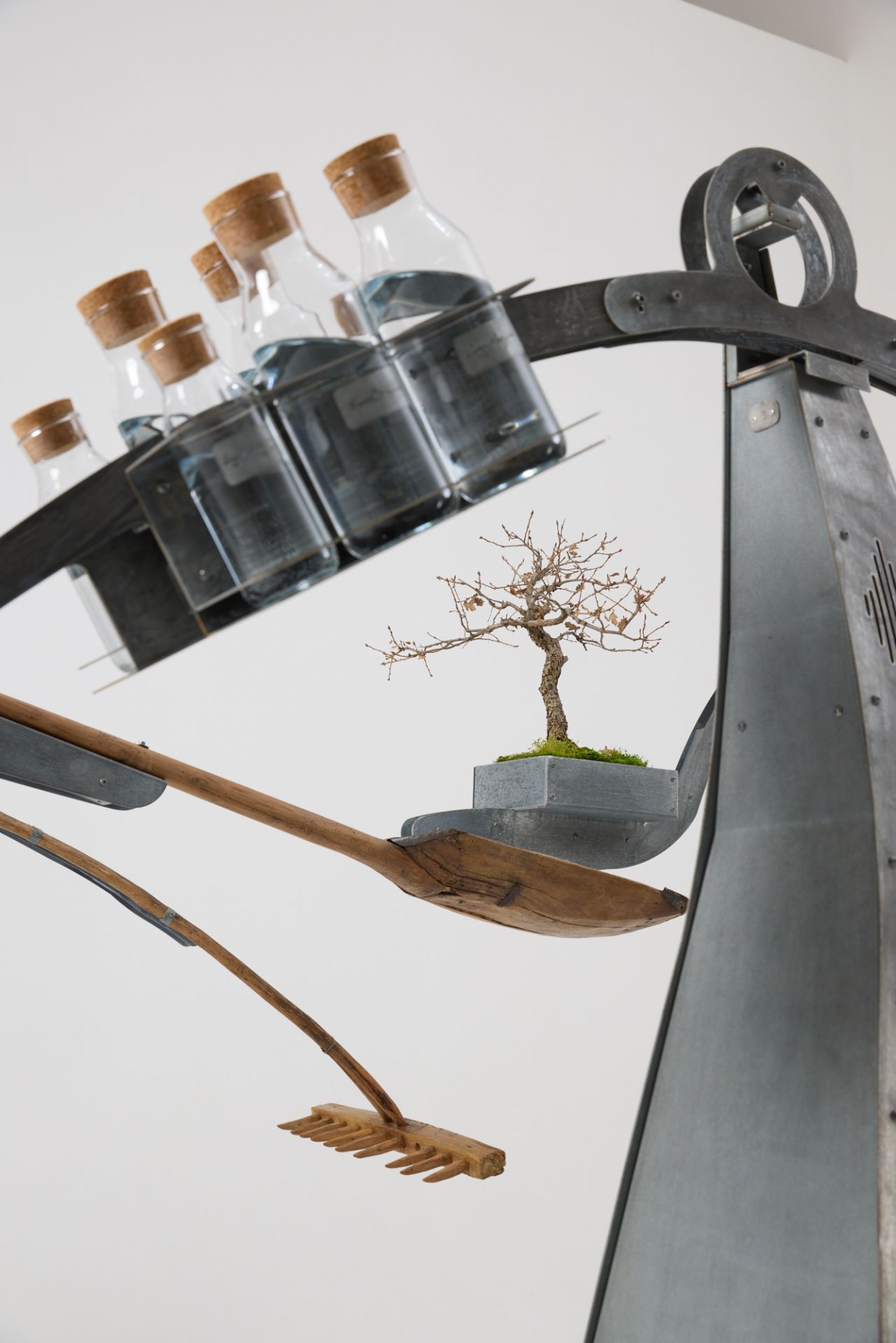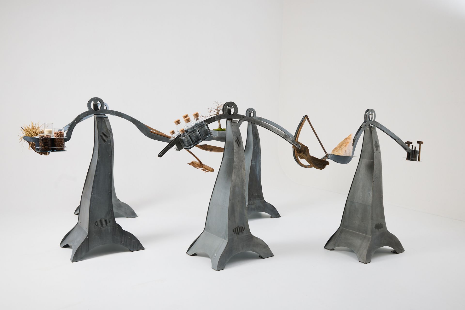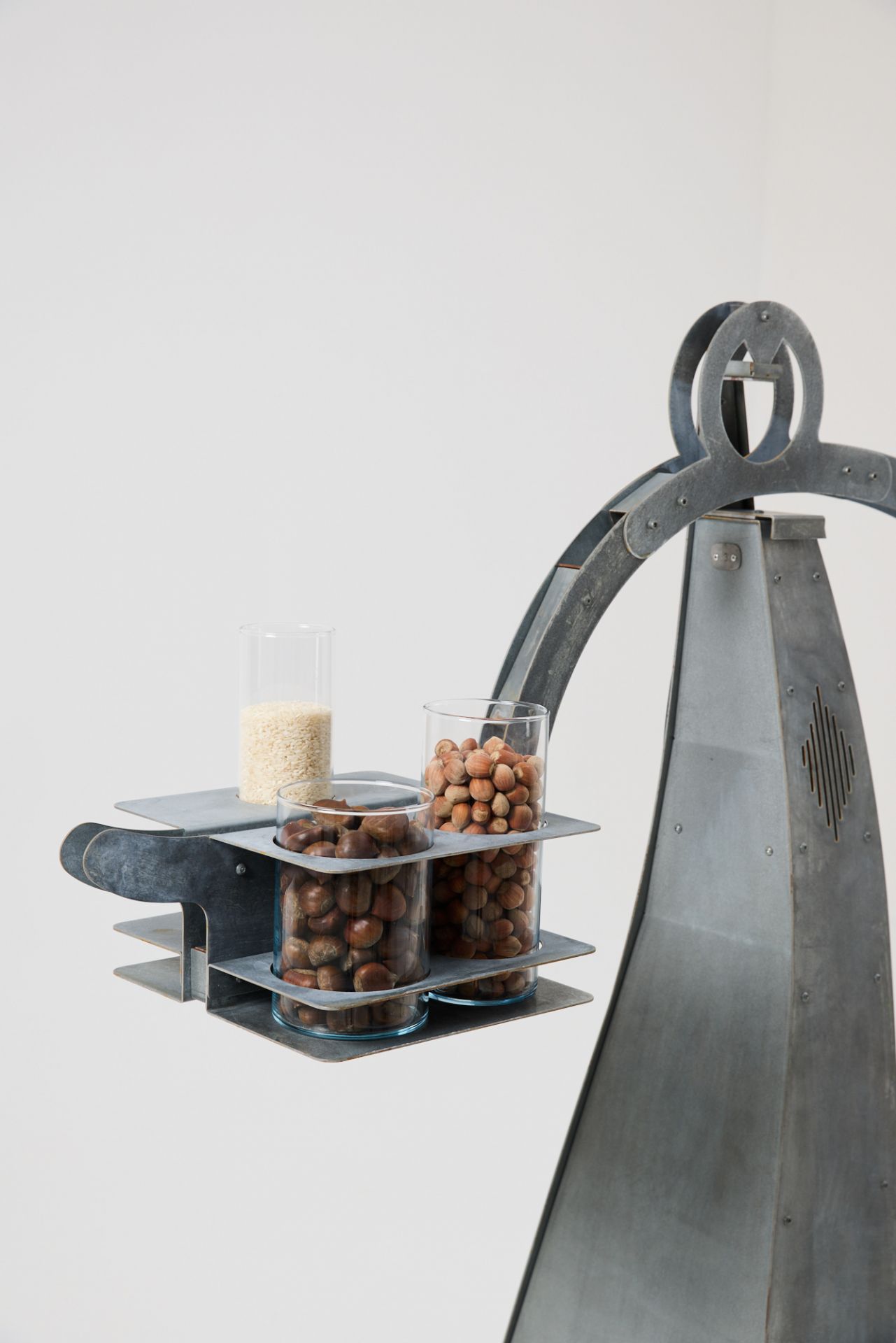 LA MOSTRA, 7 INSTALLAZIONI TRA PESI E CONTRAPPESI NATURALI E ANTROPICI – 7 grandi bilance, con grandi braccia in movimento che portano esperienze umane e valori naturali e che raccontano le comunità tra Lombardia e Piemonte, tra ambiente e creatività, natura e ingegno umano. E' questo il cuore della mostra, realizzata dall’artista Claudio Ballestracci. “La bilancia non funziona soltanto come simbolo. È una macchina che rende visibile la natura relazionale del reale: ogni peso è tale solo in rapporto a un contro-peso; ogni misura implica una reciprocità. L’equilibrio emerge esclusivamente da una dinamica di compensazioni. In questo senso – sottolinea l’artista- l’opera si colloca in una linea di pensiero che rifiuta la visione dell’ecosistema come struttura statica. L’installazione traduce questa consapevolezza in una grammatica materiale”. E allora su un piatto della bilancia compaiono strumenti agricoli primordiali, il lavoro sulla terra, la fatica dell’uomo. Sul piatto opposto, zolle, pietre, sementi, acqua raccolta da laghi e fiumi, porzioni di vegetazione. La biosfera non è contemplazione, ma sostanza attiva”.