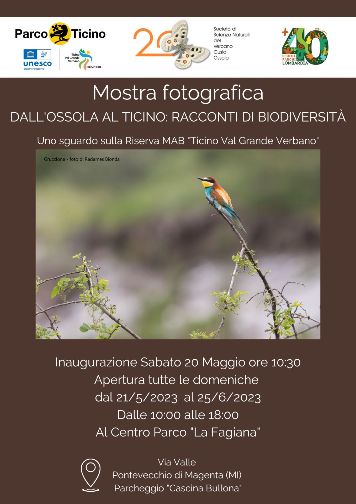 Viene inaugurata sabato 20 maggio alle 10.30 al centro Parco La Fagiana di Magenta, la mostra fotografica “Dall’Ossola al Ticino: racconti di biodiversità”, promossa dalla Società di Scienze Naturali del Verbano Cusio Ossola in occasione dei suoi primi 20 anni. La mostra sarà liberamente visitabile tutte le domeniche e festivi dalle ore 10.00 alle ore 18.00 presso il Centro Parco “La Fagiana” fino al 25 giugno. Da lì la mostra verrà poi esposta in altre prestigiose sedi all'interno della Riserva della Biosfera Ticino Val Grande Verbano.