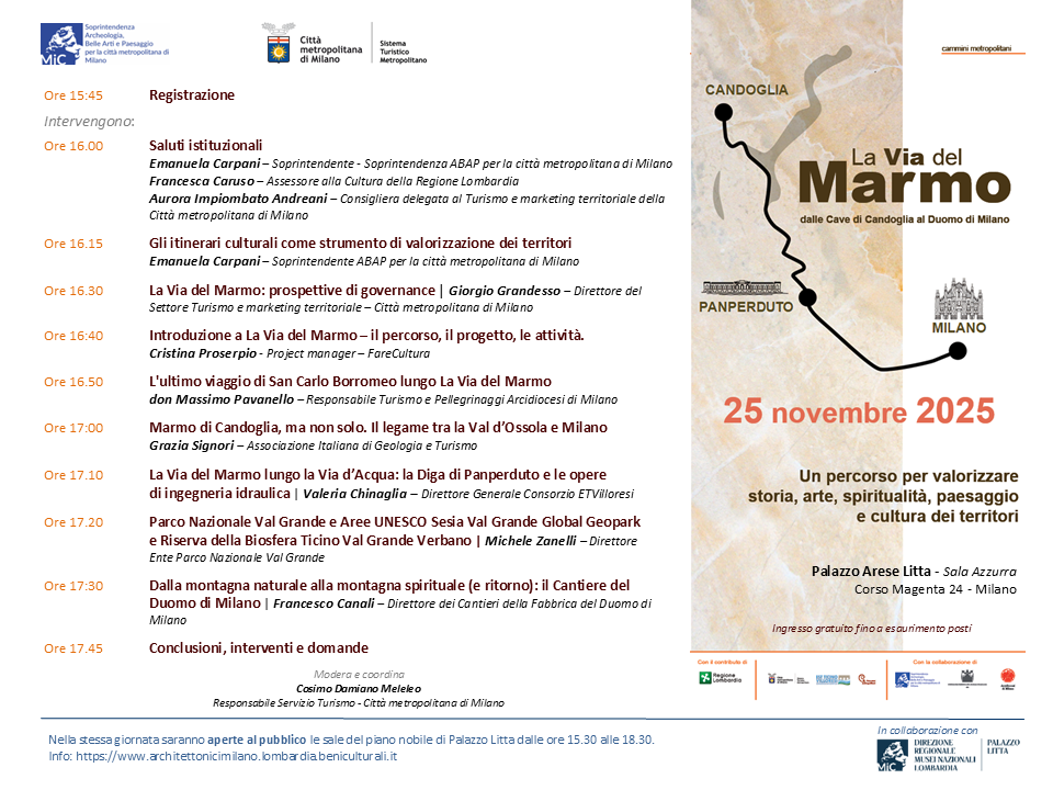 Questo martedì 25 dicembre dalle ore 15:45 a Milano, presso Palazzo Arese Litta, in Corso Magenta 24, si è tenuto un convegno incentrato su 𝐿𝑎 𝑉𝑖𝑎 𝑑𝑒𝑙 𝑀𝑎𝑟𝑚𝑜, un percorso che ha l'intendo di valorizzare la storia, l'arte, la spiritualità, il paesaggio e la cultura dei territori che attraversa, da Candoglia fino a Milano.